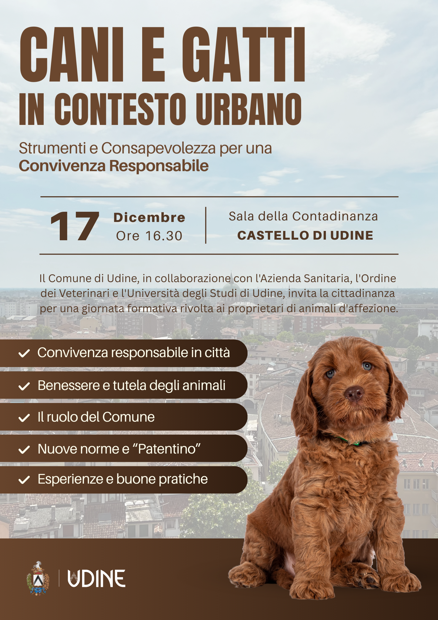 Il Comune di Udine, in collaborazione con l'Azienda Sanitaria, l'Ordine dei Veterinari e l'Università degli Studi di Udine, invita la cittadinanza all'incontro pubblico per una giornata formativa rivolta ai proprietari di animali d'affezione.