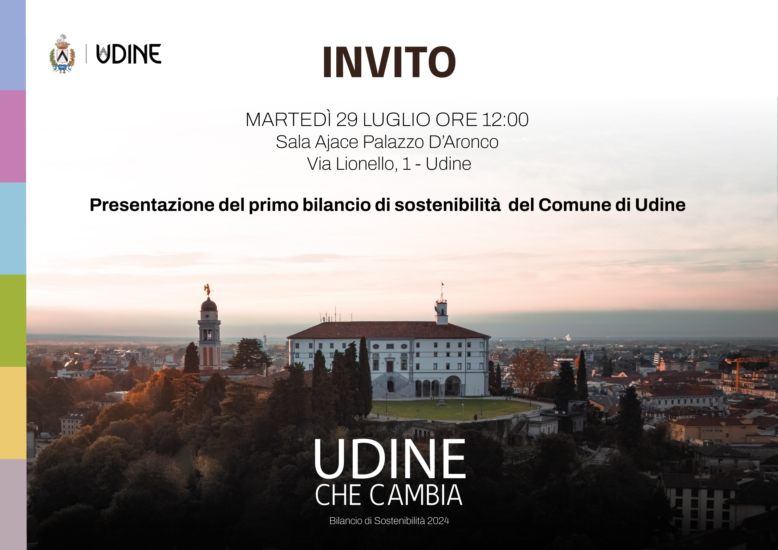 Alle 12 di oggi, 29 luglio 2025, in Sala Ajace del Palazzo D'Aronco ed in streaming sul Canale YouTube del Comune di Udine, l'Assessore Arianna Facchini con delega alle Pari Opportunità, Politiche Giovanili, Bilancio di Sostenibilità, Servizi Demografici e Statistica presenterà il Bilancio di Sostenibilità 2024 del Comune di Udine.