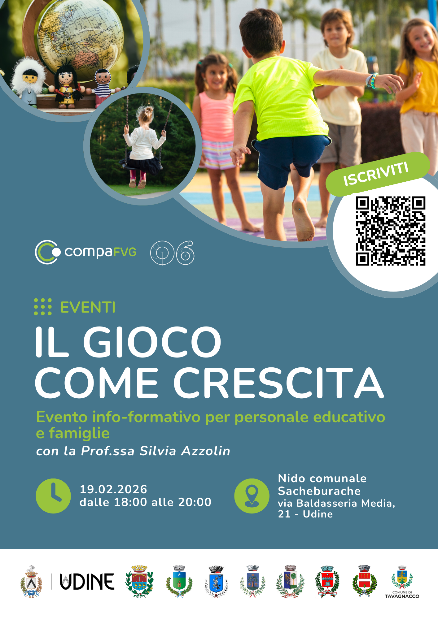 Il Comune di Udine, come capofila del Sistema pedagogico integrato, nell'ambito delle azioni previste dal D.LGS 65/2017, organizza un evento formativo in data 19/02/2026 dalle ore 18.00 alle ore 20.00 presso il Nido Comunale "Sacheburache" di Via Baldasseria Media n. 21 - Udine.