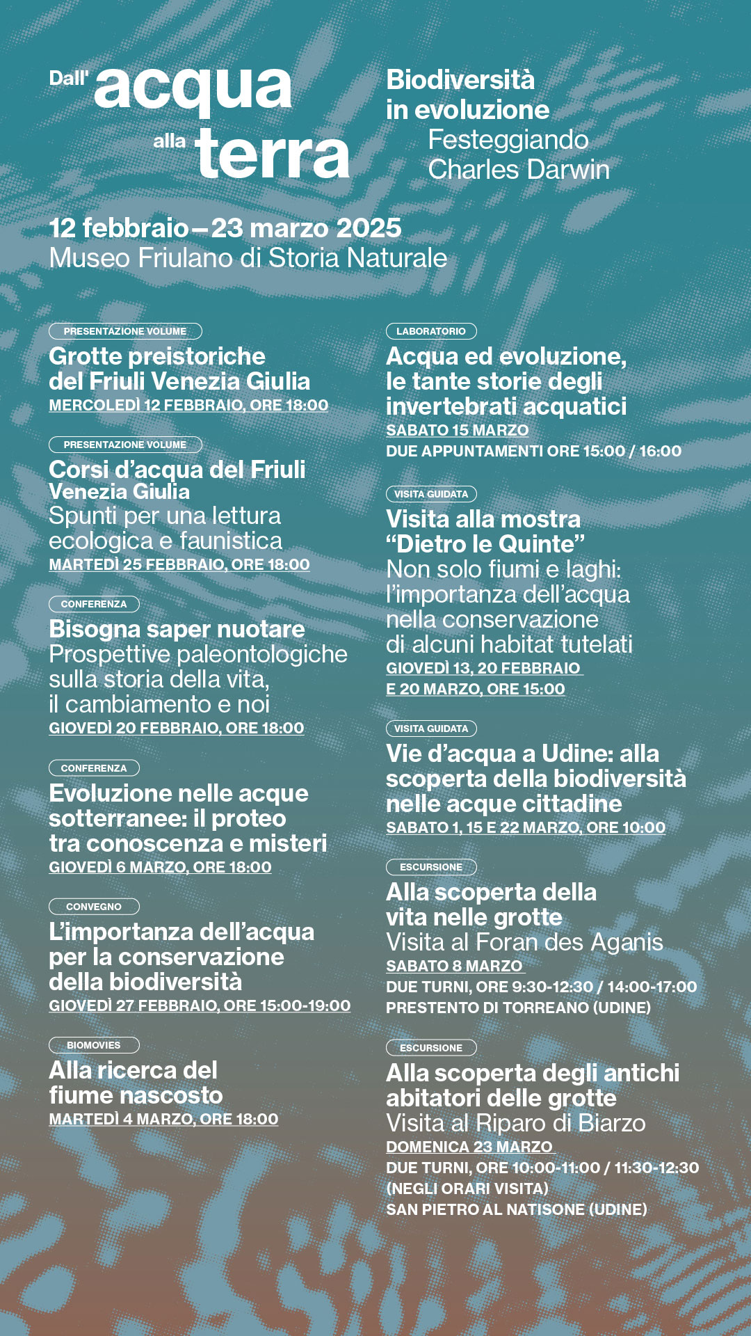 Il Museo Friulano di Storia Naturale per il Darwin day 2025 organizza una serie di eventi divulgativi aperti a tutti, incentrati sull'acqua, risorsa fondamentale che ha plasmato l'evoluzione e la biodiversità.