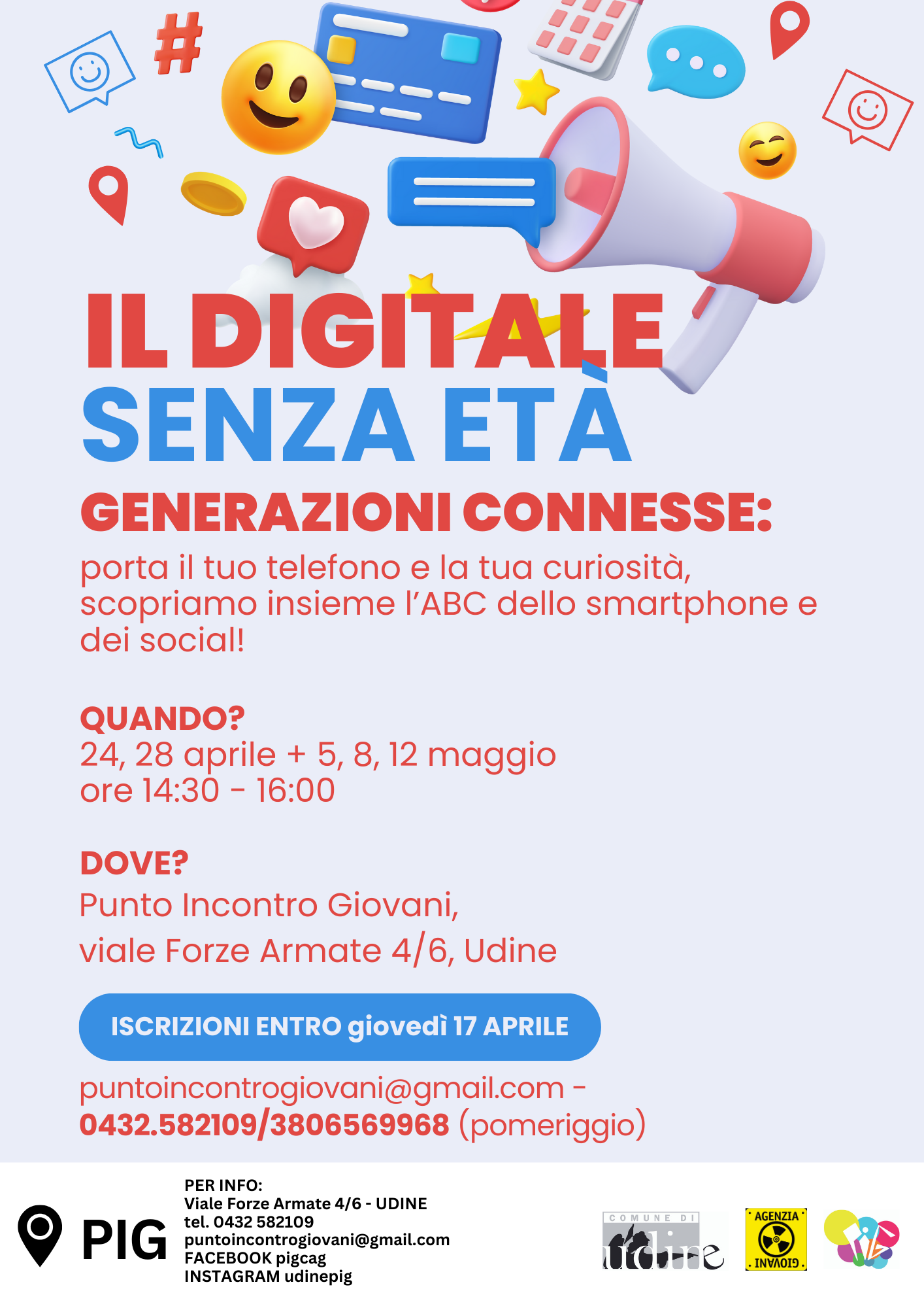 L’iniziativa “Il digitale senza età. Generazioni connesse” invita le persone a partecipare portando il proprio smartphone e la propria curiosità per scoprire insieme le basi dell’uso degli smartphone e dei social media. Questo tipo di evento promuove l’alfabetizzazione digitale intergenerazionale, offrendo l’opportunità di apprendere e condividere competenze tecnologiche tra diverse fasce d’età.
