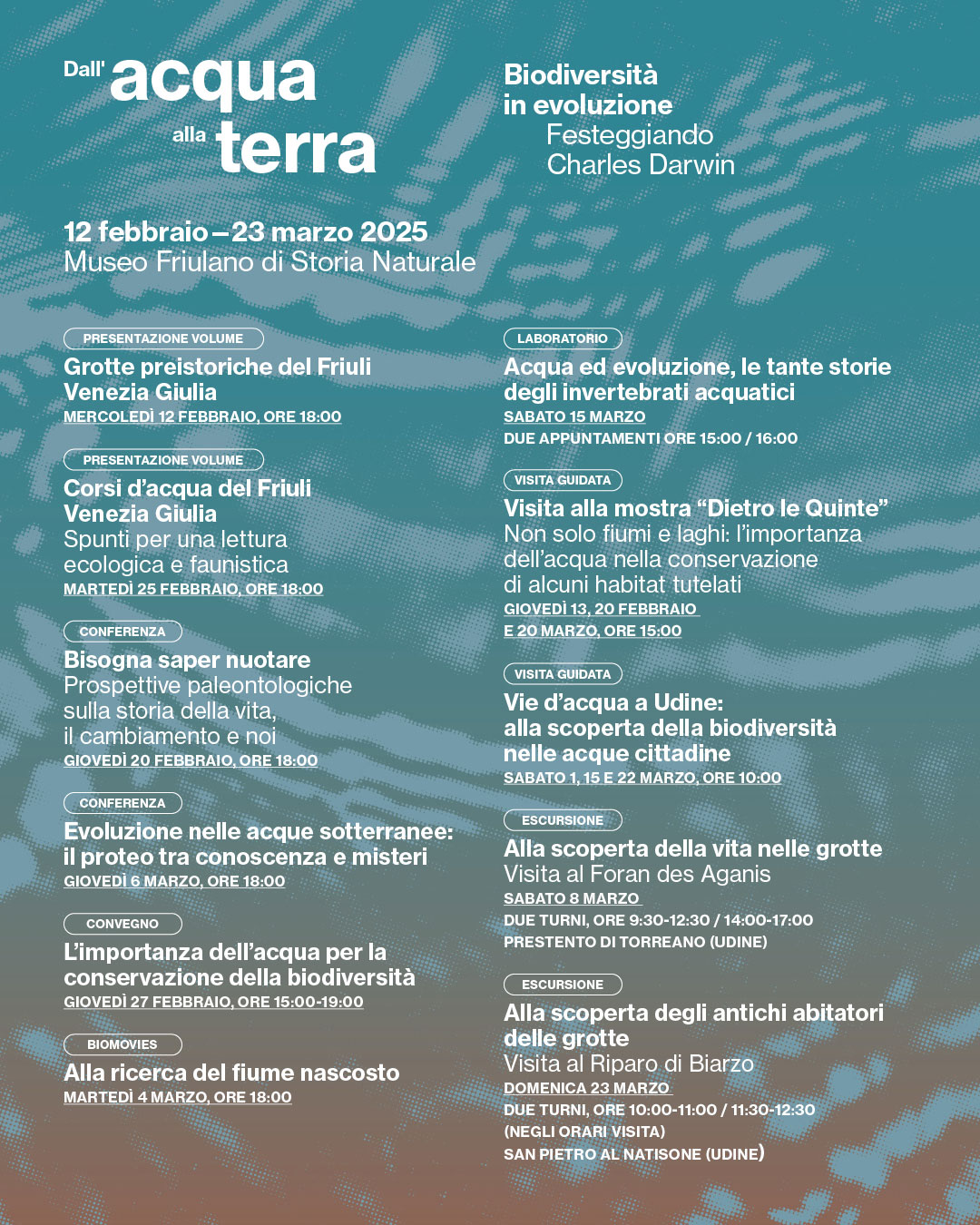 La rassegna dedicata a Dall'acqua alla terra: biodiversità in evoluzione, organizzata dal Museo Friulano di Storia Naturale per il Darwin day 2025, prosegue con la conferenza Evoluzione nelle acque sotterranee: il Proteo tra conoscenze e misteri.