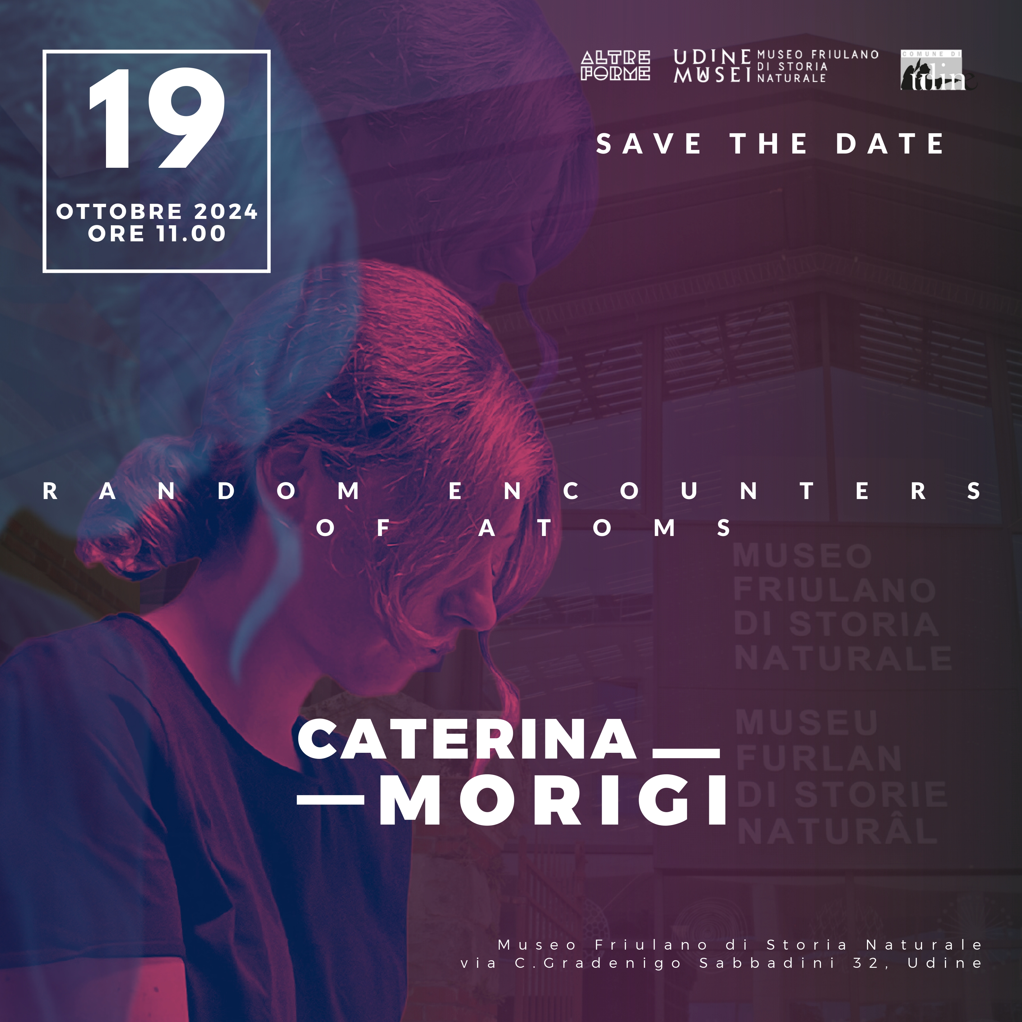 L'artista visiva Caterina Morigi, ospite della residenza artistica organizzata dal Museo Friulano di Storia Naturale nell'ambito della rassegna Obiettivi possibili. Il museo incontra la sostenibilità ha creato il trittico Incontri casuali di atomi - random encounters of atoms, frutto di un lavoro di montaggio nel quale la luce agisce attraverso una lenta trasformazione della pellicola in un gioco sottile con il fenomeno dell’iridescenza. "In quest'opera energia e trasformazione richiedono uno sguardo reiterato nel tempo, come quello dello scienziato che ha a che fare con la mutevolezza della vita. E forse è lo stesso sguardo che la nostra esistenza ci richiede ciascuna volta".