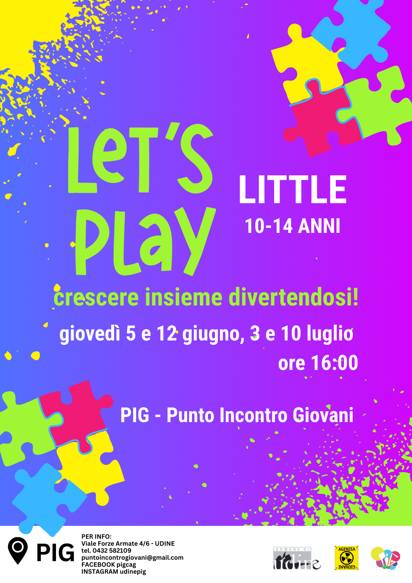 Il Punto Incontro Giovani è lieto di invitarvi a "LET’S PLAY - LITTLE", un ciclo di quattro incontri dedicato a ragazze e ragazzi dai 10 ai 14 anni, ideato per scoprire giochi e favorire la collaborazione di gruppo: un’occasione per crescere insieme divertendosi!